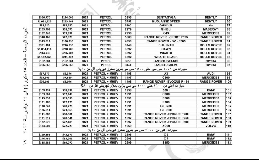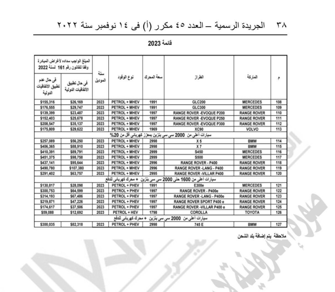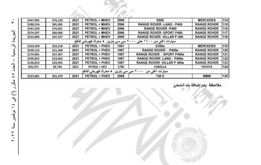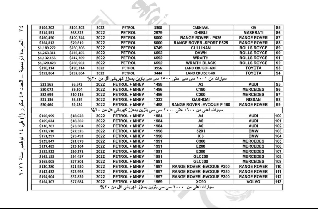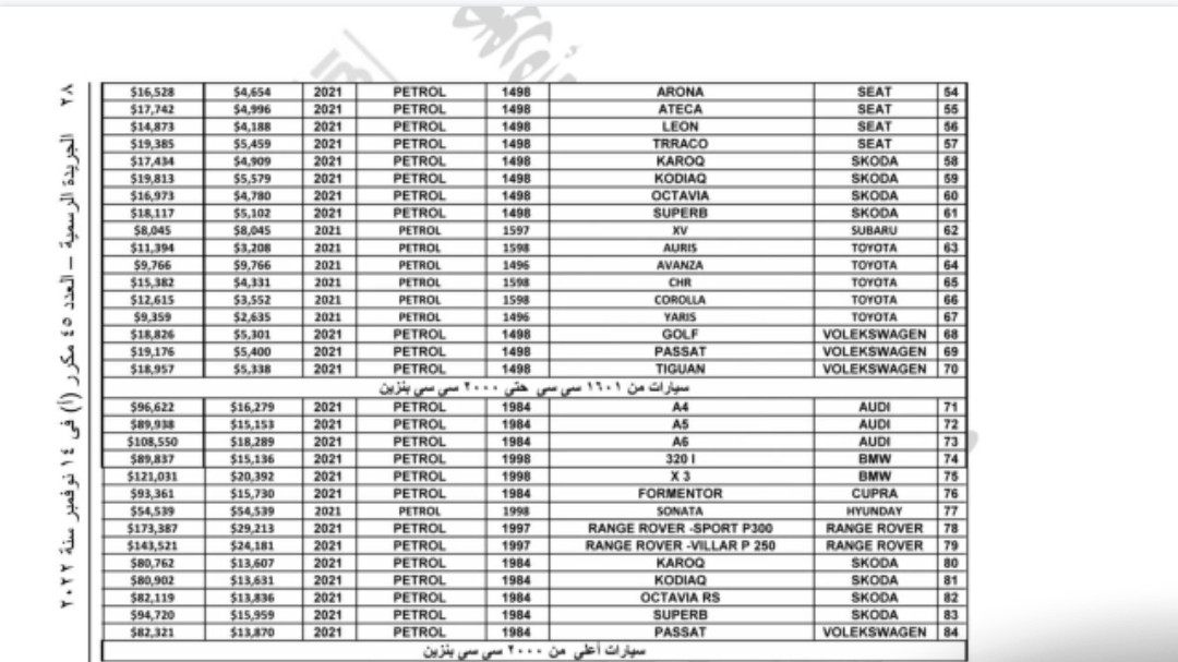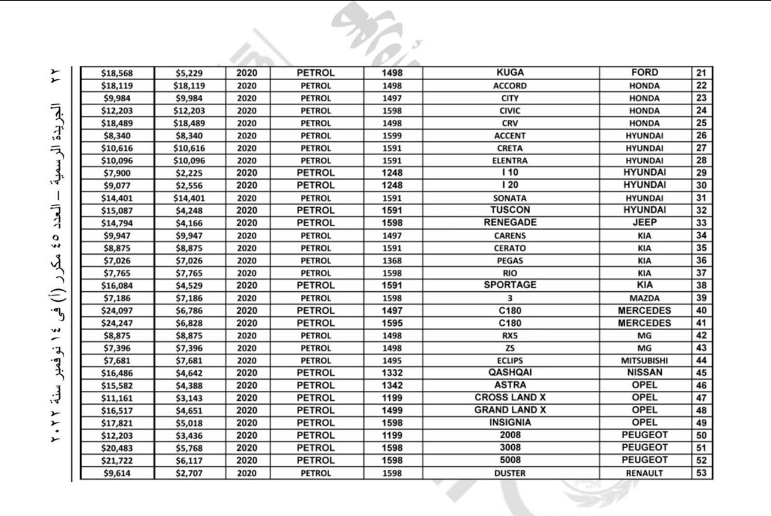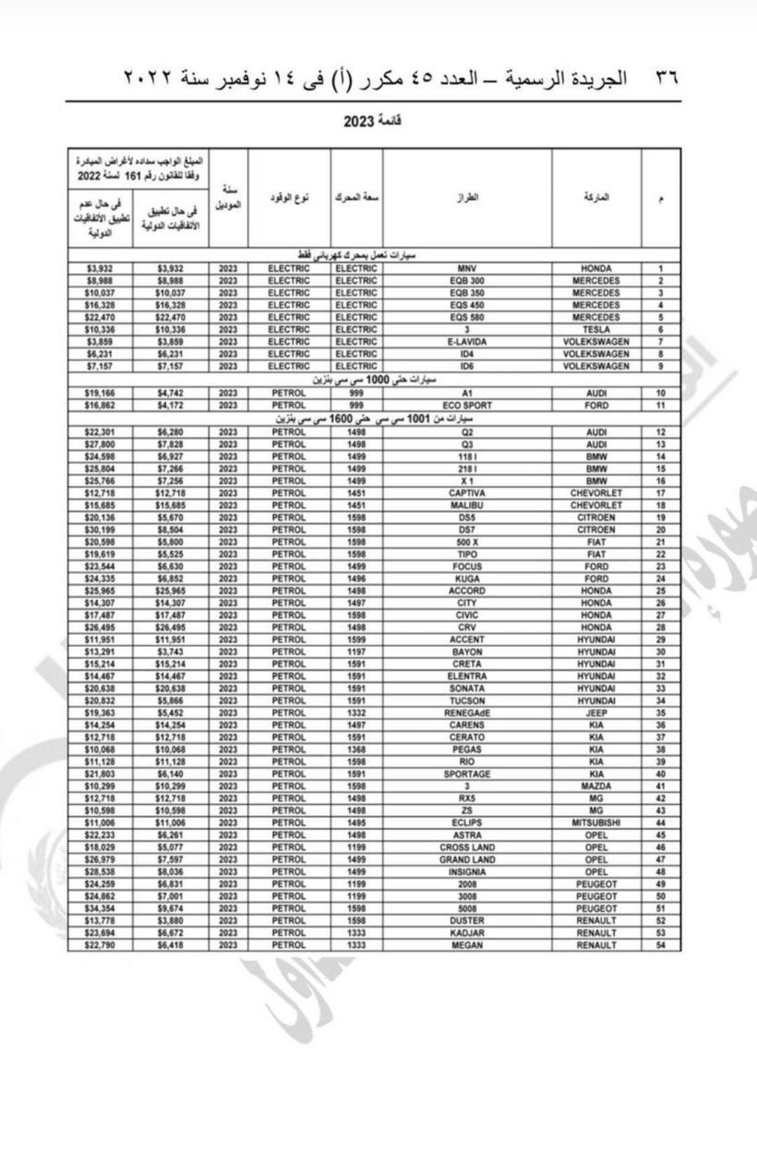 ينشر "مصر تايمز" جداول المبالغ المالية المستحقة لاستيراد سيارات المصريين في الخارج بدون جمارك في صورة وديعة تُسترد بعد 5 سنوات.