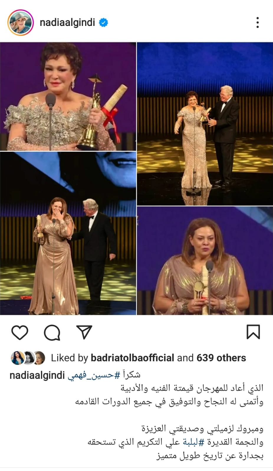 نشرت نادية الجندي عبر صفحتها على موقع تبادل الصور والفيديوهات "إنستجرام" قائلة: "شكراً حسین فهمي الذي أعاد للمهرجان قيمته الفنية والأدبية، وأتمنى له النجاح والتوفيق في جميع الدورات القادمه ومبروك لزميلتي وصديقتي العزيزة ، والنجمة القديرة لبلبة علي التكريم الذي تستحق بجدراة عن تاريخ طويل متميز".