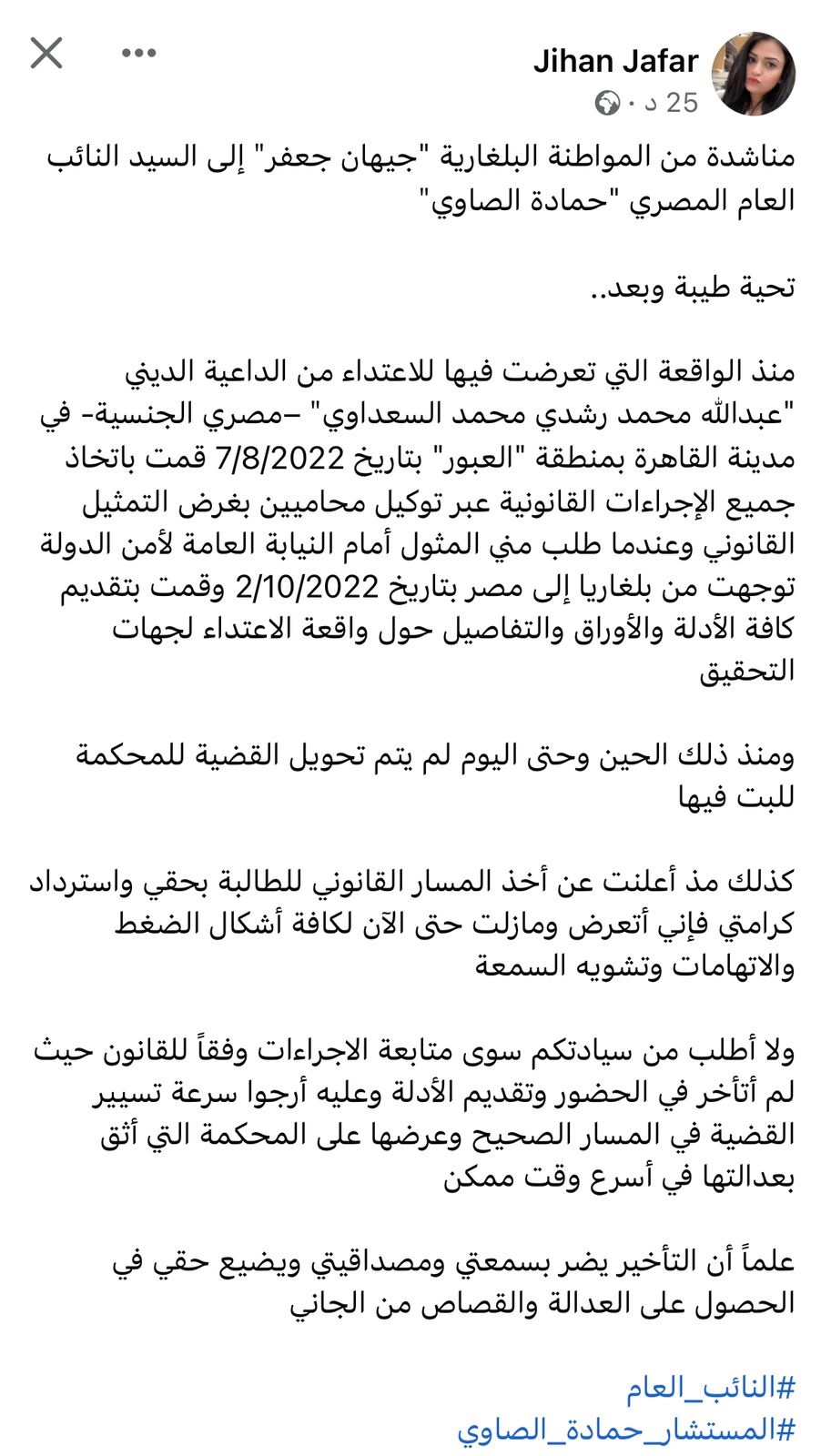 وأشارت جعفر، إلى أن منذ الواقعة التي تعرضت فيها للاعتداء من الداعية الديني "عبدالله محمد رشدي محمد السعداوي" –مصري الجنسية- في مدينة القاهرة بمنطقة "العبور" بتاريخ 7/8/2022 قمت باتخاذ جميع الإجراءات القانونية عبر توكيل محاميين بغرض التمثيل القانوني وعندما طلب مني المثول أمام النيابة العامة لأمن الدولة توجهت من بلغاريا إلى مصر بتاريخ 2/10/2022 وقمت بتقديم كافة الأدلة والأوراق والتفاصيل حول واقعة الاعتداء لجهات التحقيق ومنذ ذلك الحين وحتى اليوم لم يتم تحويل القضية للمحكمة للبت فيها