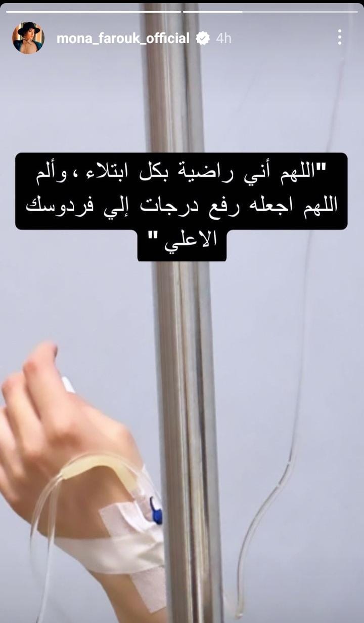 وكتبت منى فاروق في تعليقها على الصورة التي نشرتها من داخل المستشفى: "اللهم انى راضية بكل ابتلاء وألم اللهم اجعله رفع درجات الي فردوسك الاعلى من الجنة".
