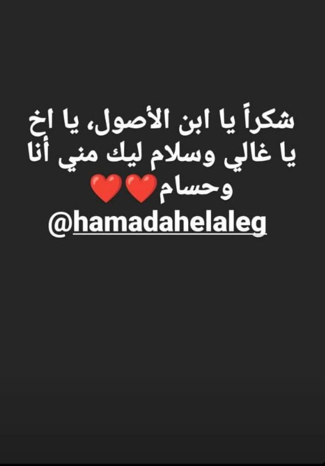 وكتبت شيرين عبد الوهاب عبر حسابها على موقع تبادل الصور والفيديوهات "إنستجرام" خلال خاصية الاستوري قائلة:" شكرًا يا ابن الاصول، يا أخ يا غالي، وسلام ليك مني انا وحسام".