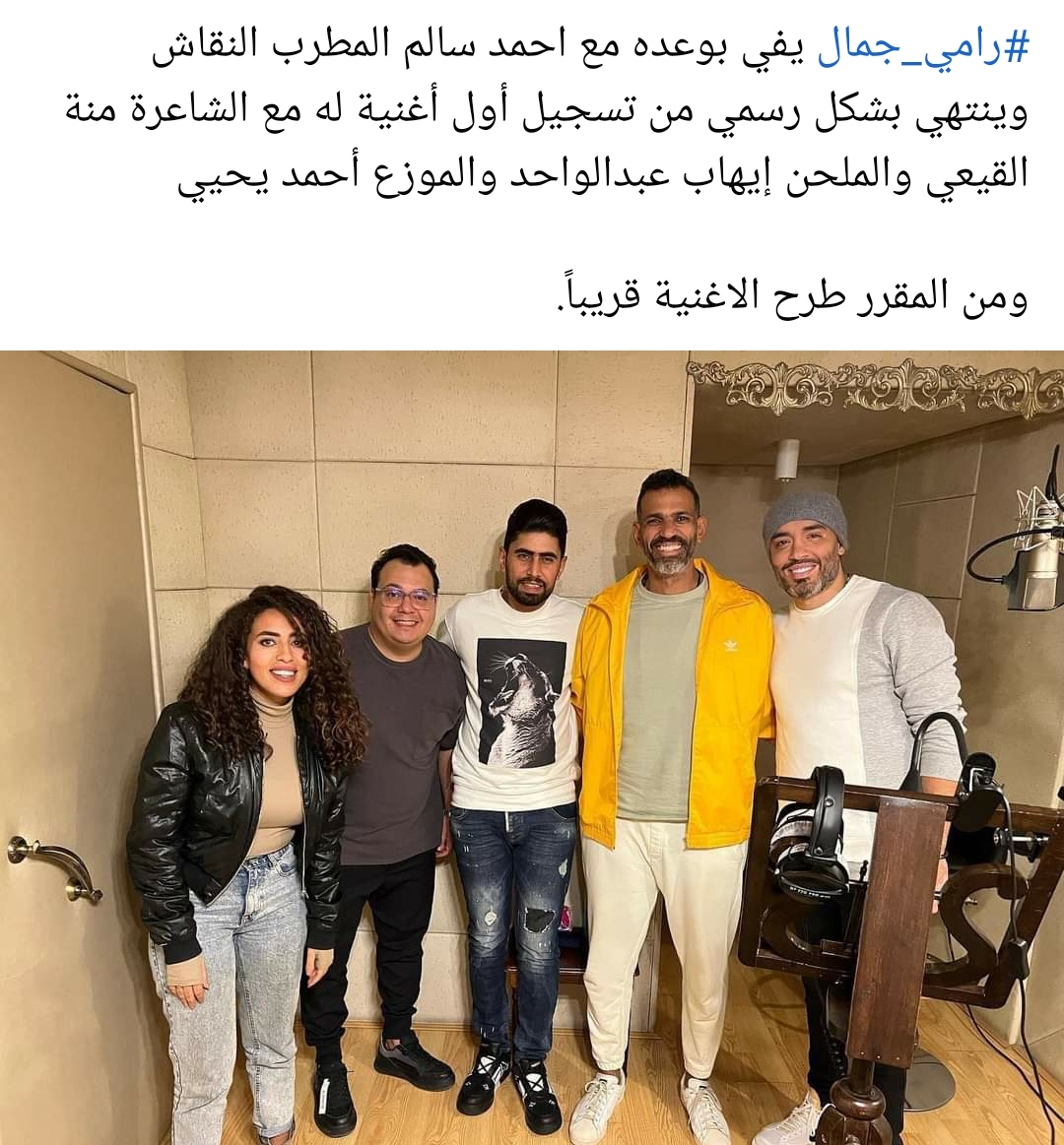 وانتهي رامي جمال بشكل رسمي من تسجيل أول أغنية له مع الشاعرة منة القيعي والملحن إيهاب عبدالواحد والموزع أحمد يحيي.