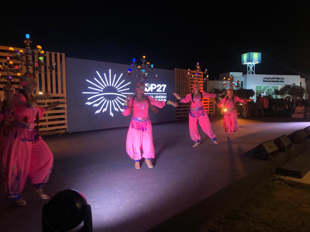 وعلى صعيد الحفلات الفنية، استقبل مسرح الجرين زون، فرقتي الشرقية للفنون الشعبية، وفرقة التنورة التراثية، التابعتان للهيئة العامة لقصور الثقافة، وقدمت فرقة الشرقية، عددًا من التابلوهات الريفية التي أبهرت زائري المنطقة الخضراء، كما شهد عرض التنورة إقبالًا كبيرًا من ضيوف مصر بقمة المناخ.