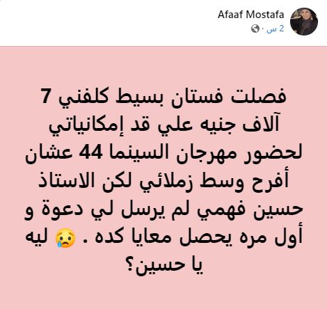 كتبت عفاف مصطفى، عبر حسابها الرسمي بموقع التواصل الاجتماعي “الفيسبوك”: " فصلت فستان بسيط كلفني 7 آلاف جنيه علي قد إمكانياتي لحضور مهرجان السينما 44 عشان أفرح وسط زملائي لكن الاستاذ حسين فهمي لم يرسل لي دعوة و أول مره يحصل معايا كده، ليه يا حسين؟..ليست المرة الأولى".