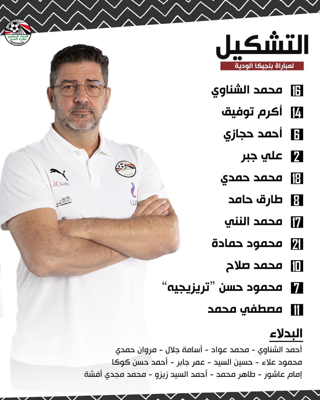 أعلن الجهاز الفني لمنتخب مصر الأول لكرة القدم بقيادة البرتغالي روي فيتوريا تشكيل ودي بلجيكا المقرر لها الخامسة مساء اليوم باستاد جابر الأحمد الدولي وجاء كالتالي :