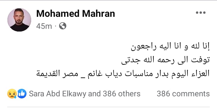 وكتب محمد مهران عبر حسابه الرسمي بموقع التواصل الاجتماعي “فيس بوك”: إنا لله وإنا إليه راجعون توفت إلى رحمة الله جدتي، والعزاء اليوم بدار مناسبات دياب غانم مصر القديمة.