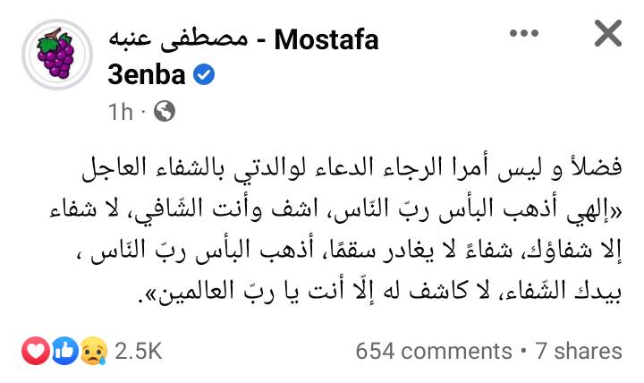 كتب عنبة عبر حسابه الرسمي بموقع التواصل الإجتماعي “فيس بوك”: فضلأ و ليس أمرا الرجاء الدعاء لوالدتي بالشفاء العاجل إلهي أذهب البأس ربّ النّاس، اشف وأنت الشّافي، لا شفاء إلا شفاؤك، شفاءً لا يغادر سقمًا، أذهب البأس ربّ النّاس ، بيدك الشّفاء، لا كاشف له إلّا أنت يا ربّ العالمين".