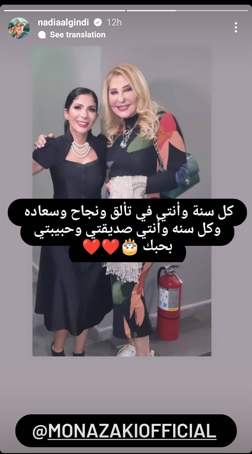 ونشرت نادية الجندي صورة برفقة مني زكي، معلقة عليها:" كل سنة وانتي في تألق ونجاح وسعادة وكل سنة وانتي صديقتي و حبيبتي بحبك".