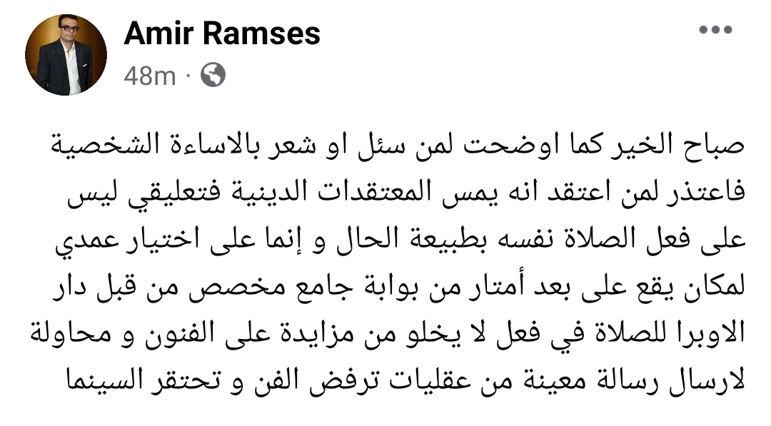 ونشر أمير رمسيس عبر صفحته على موقع التواصل الاجتماعي "الفيسبوك" قائلا: “صباح الخير كما اوضحت لمن سئل او شعر بالاساءة الشخصية فاعتذر لمن اعتقد انه يمس المعتقدات الدينية فتعليقي ليس على فعل الصلاة نفسه بطبيعة الحال”.
