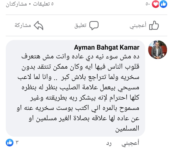 وتابع أيمن بهجت قمر: "أنا لما لاعب مسيحي بيعمل علامة الصليب بنظر له بنظرة كلها احترام لإنه بيشكر ربه بطريقته، وغير مسموح بالمرة إني أكتب بوست سخرية عنه أو عن عادة لها علاقة بصلاة غير المسلمين أو المسلمين".
