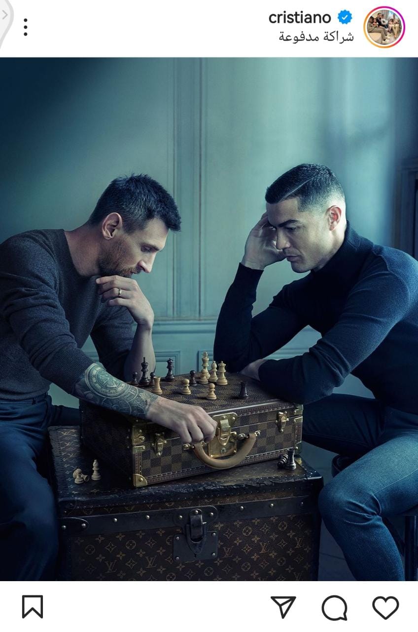 ونشر النجم البرتغالى كريستيانو رونالدو، عبر حساباته المختلفة بمواقع التواصل الاجتماعى، صورة تجمعه مع النجم الأرجنتيني ليونيل ميسي، وهما يتنافسان فى مباراة فى لعبة الشطرنج، فى إعلان خاص بمونديال قطر 2022.