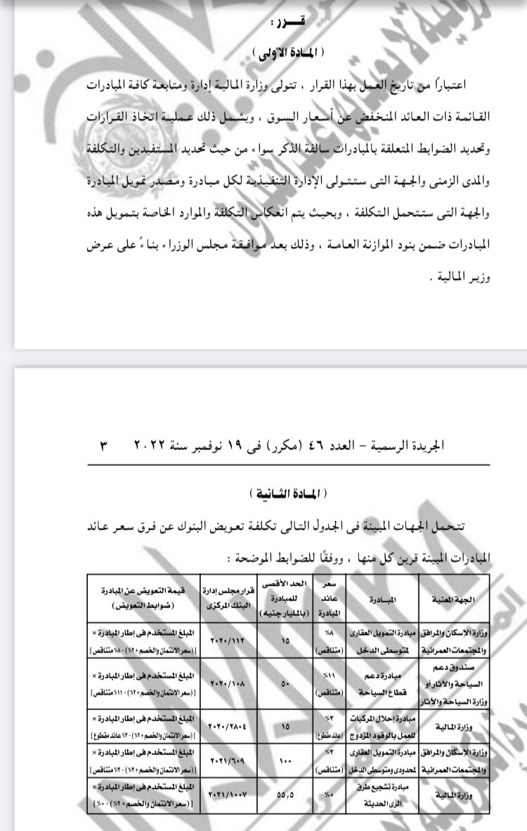 وشمل القرار إنه يحظر مستقبلا على كافة الجهات أو الهيئات بما فى ذلك البنك المركزي إعداد أو صياغة أو تمويل أي مبادرات جديدة أو تعديل أي مبادرة قائمة يترتب عليها أعباء مالية مباشرة أو غير مباشرة على الخزانة العامة.