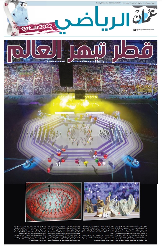 وفي الملحق الرياضي لصحيفة "عمان"، تصدر عنوان "قطر تبهر العالم" حيث كتبت الصحيفة، نظمت قطر حفل افتتاح مبهر للنسخة الثانية والعشرين من بطولة كأس العالم لكرة القدم والتي انطلقت الأحد وتستمر حتى 18 ديسمبر المقبل، وبدأ حفل الافتتاح بمجموعة من الاستعراضات الراقصة التي أشعلت حماس الجماهير سبقها فقرة غنائية من التراث في بداية الحفل، وشهد حفل الافتتاح عرضا خاصا لتميمة البطولة التي تطايرت في الهواء على أنغام الموسيقى، وبعدها ألقى النجم السينمائي الشهير مورجان فريمان كلمة برفقة الشاب القطري غانم المفتاح سفير النوايا الحسنة في قطر.