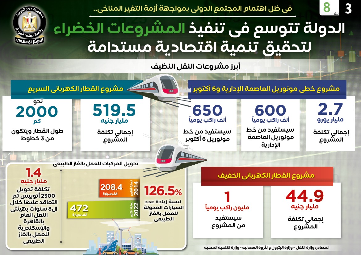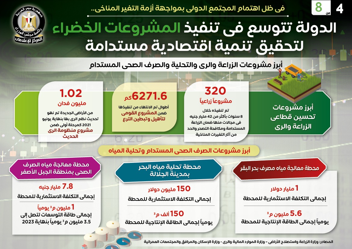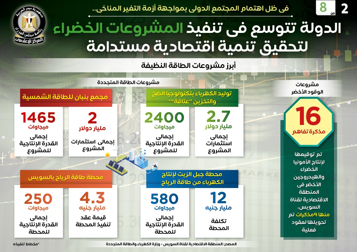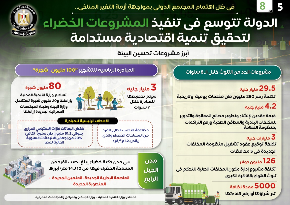 الحكومة: الدولة تتوسع في تنفيذ المشروعات الخضراء لتحقيق تنمية اقتصادية مستدامة (إنفوجراف)