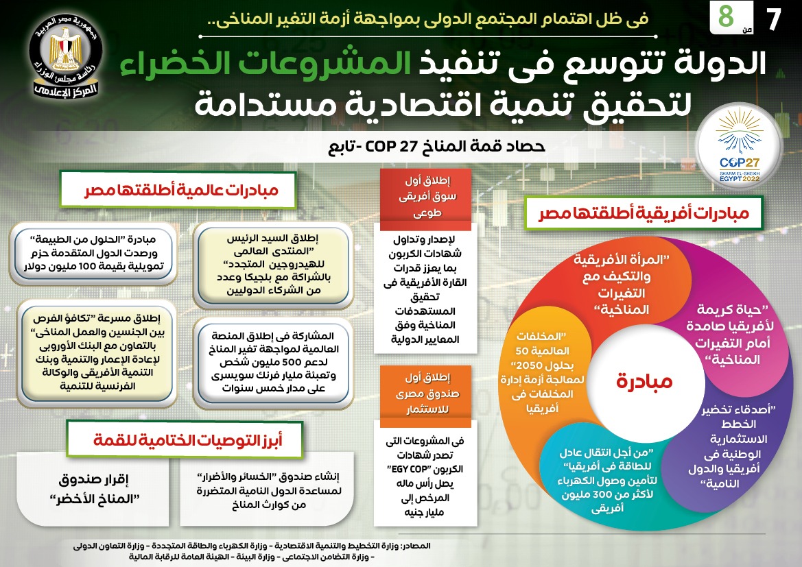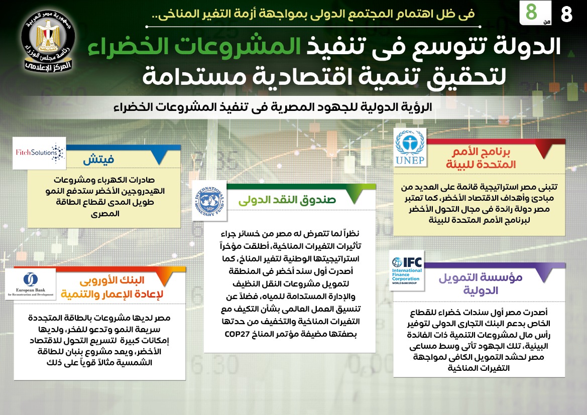وفي هذا الصدد نشر المركز الإعلامي لمجلس الوزراء تقريراً تضمن إنفوجرافات تسلط الضوء على جهود الدولة للتوسع في تنفيذ المشروعات الخضراء لتحقيق تنمية اقتصادية مستدامة، في ظل اهتمام المجتمع الدولي بمواجهة أزمة التغير المناخي.