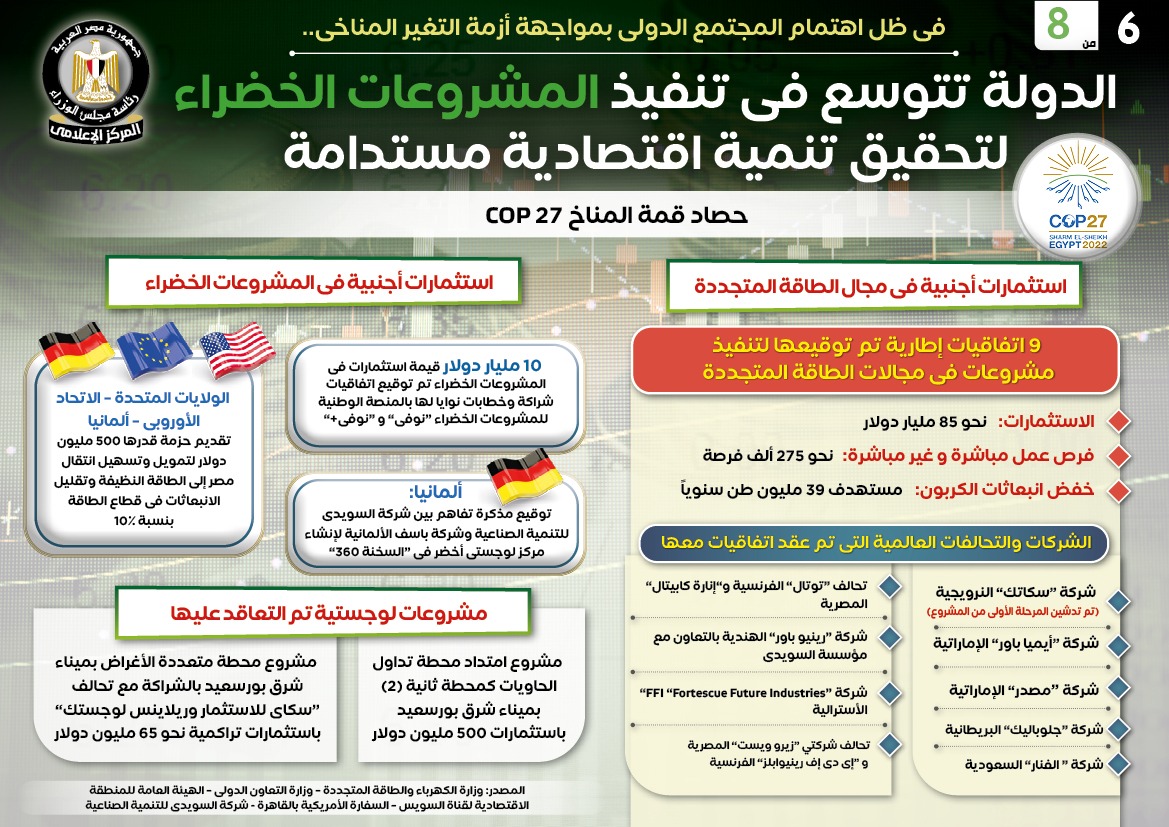 وأبرز التقرير حصاد قمة المناخ COP 27، ففيما يتعلق بالاستثمارات الأجنبية في مجال الطاقة المتجددة، فقد تم توقيع 9 اتفاقيات إطارية، بنحو 85 مليار دولار، حيث ستوفر نحو 275 ألف فرصة عمل مباشرة وغير مباشرة، كما تستهدف خفض انبعاثات الكربون بواقع 39 مليون طن سنويًا.