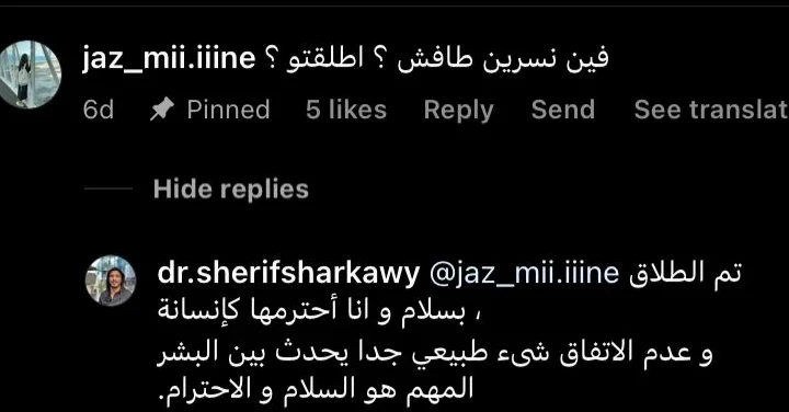 ورد على سؤال أحد المتابعين عبر حسابه الشخصي بموقع إنستجرام، على سؤال فين نسرين طافش، اتطلقتوا؟.