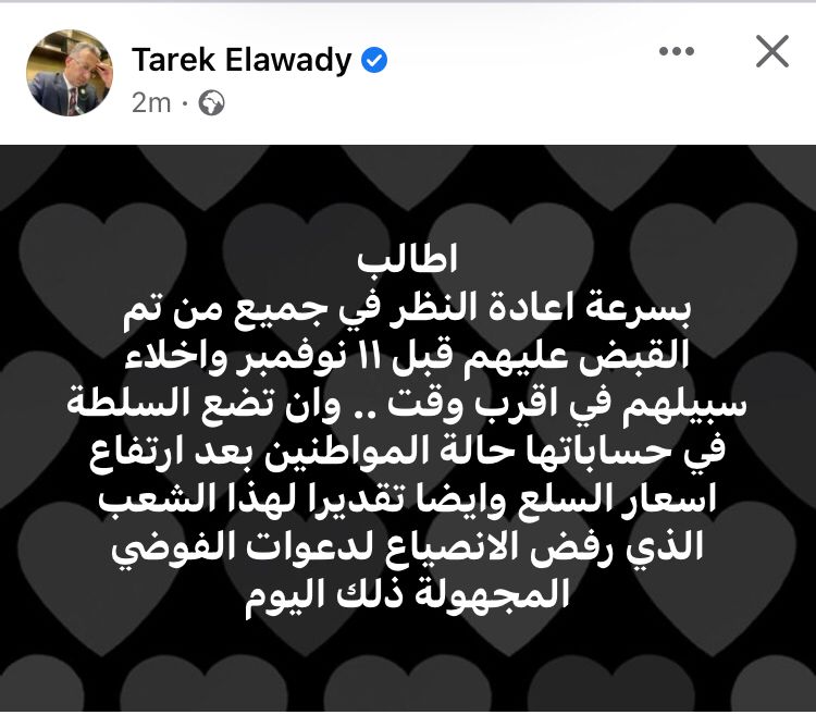 طالب طارق العوضي، المحامي بالنقض وعضو لجنة العفو الرئاسي، بسرعة اعادة النظر في جميع من تم القبض عليهم قبل 11 نوفمبر واخلاء سبيلهم في أقرب وقت.