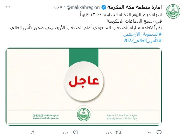 أصدرت السلطات السعودية قراراً جديداً، اليوم الثلاثاء، يقضي بإنهاء دوام الموظفين في جميع الجهات الحكومية الساعة 12 ظهراً بالتوقيت المحلي، لإفساح المجال أمام مشاهدة مباراة السعودية والأرجنتين، ضمن منافسات الجولة الأولى لدور المجموعات في بطولة كأس العالم 2022 المقامة حالياً في قطر.