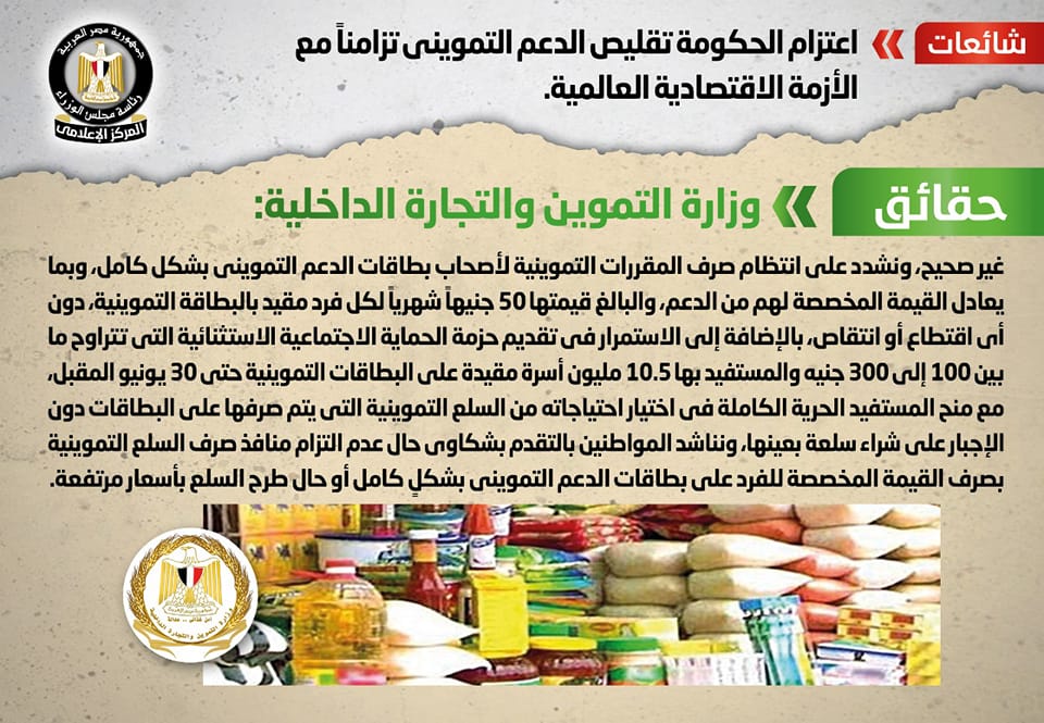 قام المركز الإعلامي لمجلس الوزراء بالتواصل مع وزارة التموين والتجارة الداخلية، والتي نفت تلك الأنباء، مُؤكدةً أنه لا صحة لاعتزام الحكومة تقليص الدعم التمويني تزامناً مع الأزمة الاقتصادية العالمية، مُشددةً على انتظام صرف المقررات التموينية لأصحاب بطاقات الدعم التمويني بشكل كامل، وبما يعادل القيمة المخصصة لهم من الدعم، والبالغ قيمتها 50 جنيهاً شهرياً لكل فرد مقيد بالبطاقة التموينية، دون أي اقتطاع أو انتقاص، بالإضافة إلى الاستمرار في تقديم حزمة الحماية الاجتماعية الاستثنائية التي تتراوح ما بين 100 إلى 300 جنيه والمستفيد بها 10.5 مليون أسرة مقيدة على البطاقات التموينية حتى 30 يونيو المقبل، مع منح المستفيد الحرية الكاملة في اختيار احتياجاته من السلع التموينية التي يتم صرفها على البطاقات دون الإجبار على شراء سلعة بعينها، مُناشدةً المواطنين بالتقدم بشكاوى حال عدم التزام منافذ صرف السلع التموينية بصرف القيمة المخصصة للفرد على بطاقات الدعم التمويني بشكلٍ كامل أو حال طرح السلع بأسعار مرتفعة.