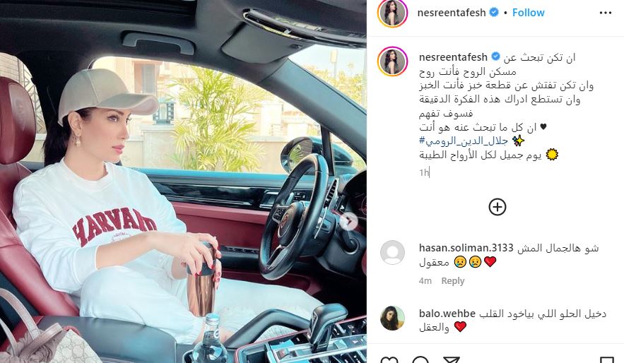 وكتب نسرين طافش عبر صفحتها على موقع تبادل الصور والفيديوهات “إنستجرام” صورة لها من داخل العربية وعلقت عليها قائلة:"“أن تكن تبحث عن مسكن الروح فأنت روح..وان تكن تفتش عن قطعة خبز فأنت الخبز..وان تستطع ادراك..هذه الفكرة الدقيقة فسوف تفهم..ان كل ما تبحث عنه هو أنت".