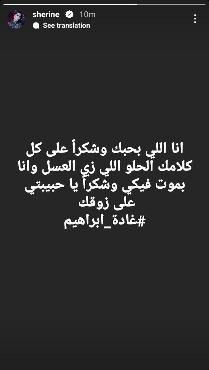 ونشرت شيرين عبد الوهاب عبر صفحتها على موقع تبادل الصور والفيديوهات "إنستجرام" خلال خاصة الإستوري قائلة: "أنا اللي بحبك وشكرا على كل كلامك الحلو اللي زي العسل وأنا بموت فيكي وشكرا يا حبيبتى على وزقك".