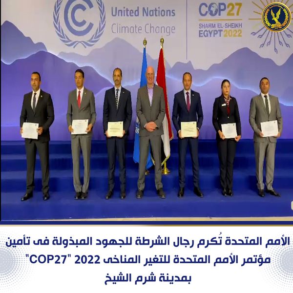 نظم مسئولى الأمم المتحدة إحتفالية تم خلالها تكريم عدد من رجال الشرطة من مختلف قطاعات الوزارة المشاركة فى إجراءات تأمين مؤتمرالأمم المتحدة للتغير المناخى 2022، والذى عُقد بمدينة شرم الشيخ ، وتسليمهم شهادات تقدير.