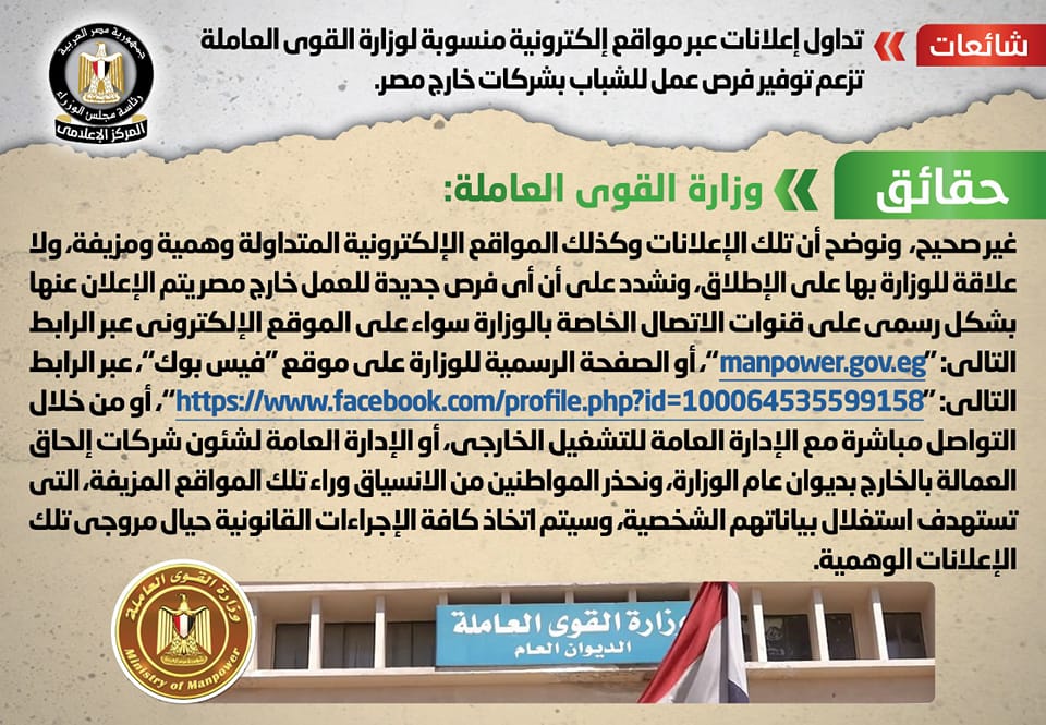 قام المركز الإعلامي لمجلس الوزراء بالتواصل مع وزارة القوى العاملة، والتي نفت تلك الأنباء، مُؤكدةً أنه لا صحة للإعلانات المتداولة المنسوبة للوزارة، والتي تزعم توفير فرص عمل للشباب بشركات خارج مصر، مُوضحةً أن تلك الإعلانات وكذلك المواقع الإلكترونية المتداولة وهمية ومزيفة، ولا علاقة للوزارة بها على الإطلاق، مُشددةً على أن أي فرص جديدة للعمل خارج مصر يتم الإعلان عنها بشكل رسمي على قنوات الاتصال الخاصة بالوزارة سواء على الموقع الإلكتروني عبر الرابط التالي: "manpower.gov.eg"، أو الصفحة الرسمية للوزارة على موقع "فيس بوك"، عبر الرابط التالي: "https://www.facebook.com/profile.php?id=100064535599158"، أو من خلال التواصل مباشرة مع الإدارة العامة للتشغيل الخارجي، أو الإدارة العامة لشئون شركات إلحاق العمالة بالخارج بديوان عام الوزارة، مُحذرةً المواطنين من الانسياق وراء تلك المواقع المزيفة، التي تستهدف استغلال بياناتهم الشخصية، وسيتم اتخاذ كافة الإجراءات القانونية حيال مروجي تلك الاعلانات الوهمية.