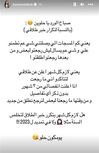 وأضافت: "يعني لازم كل شهر أعلن عن طلاقي لتتأكدوا إني ما رجعت؟ أنا أعلنت انفصالي من شهور بدون ذكر أي تفاصيل، ومن وقتها ما رجعنا لبعض لنرجع نطلق من جديد".