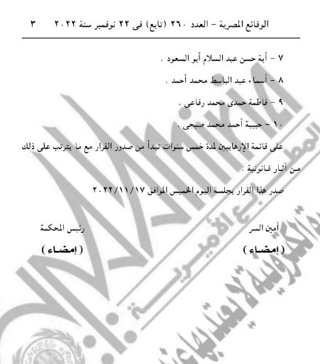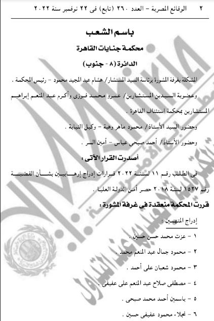 وجاء في القرار أنه في الطلب رقم 11 لسنة 2022، إدارج المتهمين لمدة 5 سنوات في القضية رقم 1527 لسنة 2018 حصر امن دولة.