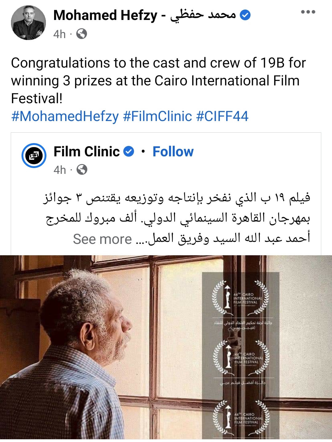 وكتب محمد حفظي على حسابه الرسمي على موقع التواصل الإجتماعي "الفيسبوك" قائلا:" تهانينا لطاقم وطاقم 19ب على فوزهم بـ 3 جوائز في مهرجان القاهرة السينمائي الدولي".