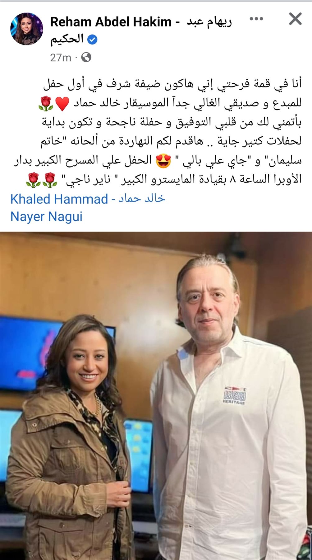 نشرت ريهام عبد الحكيم عبر صفحتها على موقع التواصل الإجتماعي "فيسبوك" قائلة :" أنا في قمة فرحتي إني هاكون ضيفة شرف في أول حفل للمبدع و صديقي الغالي جدآ الموسيقار خالد حماد.. اتمني لك من قلبي التوفيق و حفلة ناجحة و تكون بداية لحفلات كتير جاية".