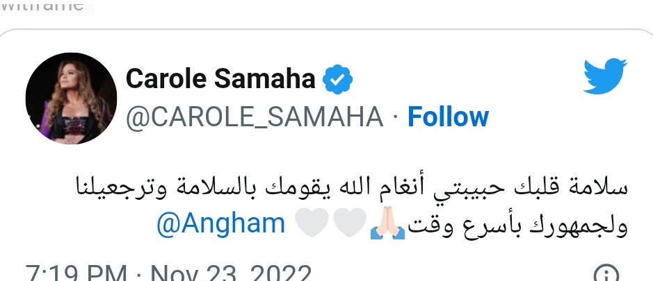 وكتبت كارول سماحة على موقع التدوينات القصيرة " تويتر" مغردة :" سلامة قلبك حبيبتي أنغام الله يقومك بالسلامة وترجعيلنا ولجمهورك بأسرع وقت".
