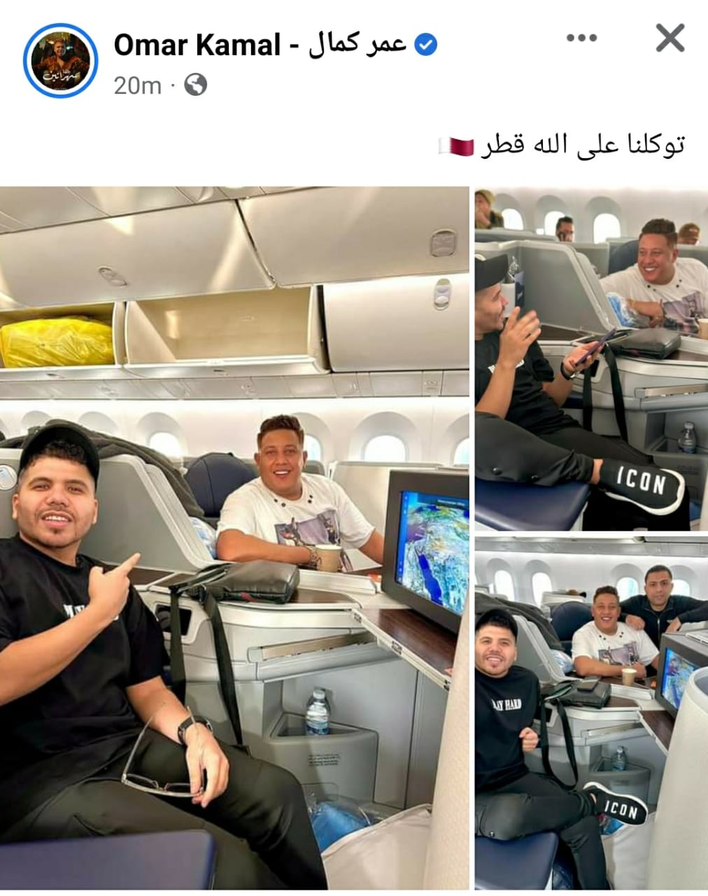 ونشر عمر كمال الصور عبر حسابه الشخصي بموقع التواصل الاجتماعي "الفيسبوك" صورة له من داخل الطائرة مع حمو بيكا، معلقًا عليها: "توكلنا على الله.. قطر"
