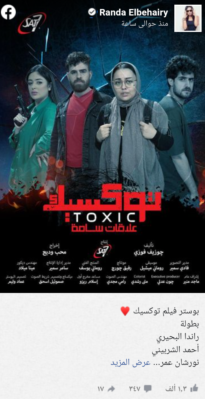 وشاركت الفنانة راندا البحيري جمهورها ومتابعيها عبر حسابها الشخصي بوستر الفيلم وعلقت عليه: بوستر فيلم توكسيك بطولة راندا البحيري وأحمد الشربيني ونورشان عمر ووسيم الدقاق والفنان القدير عبد الرحيم حسن وعفاف مصطفى، تأليف چوزيف فوزي وإخراج محب وديع.