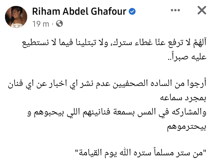 وكتبت ريهام عبد الغفور عبر حسابها على على موقع التواصل الاجتماعي “فيس بوك”: اللهم لا ترفع عنا غطاء سترك ولا تبتلينا فيما لا نستطيع عليه صبرا، أرجو من السادة الصحفيين عدم نشر أي أخبار عن أي فنان بمجرد سماعه، والمشاركة في المس بسمعة فنانينهم اللي بيحبوهم وبيحترموهم من ستر مسلما ستره الله يوم القيامة".