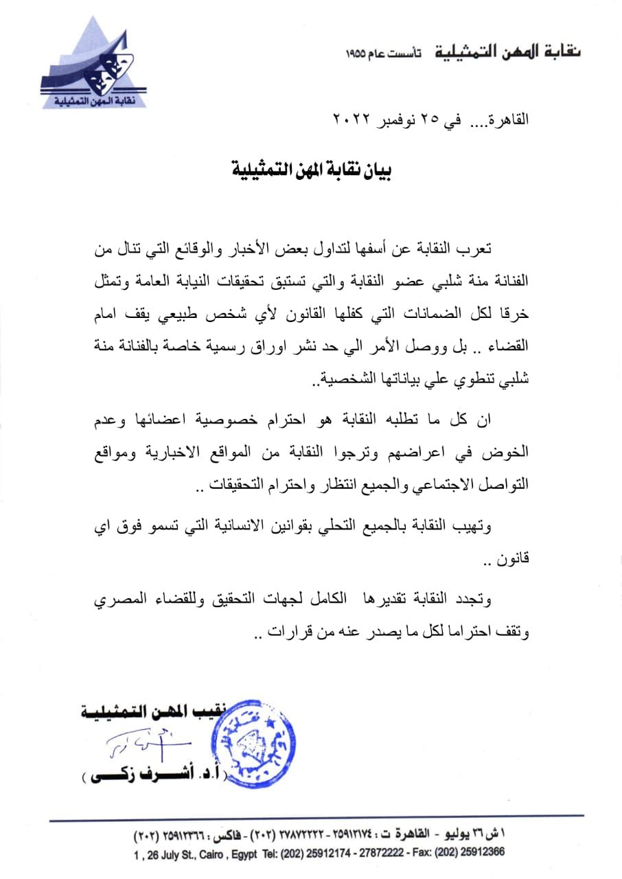 أعربت نقابة المهن التمثيلية عن أسفها لتداول بعض الأخبار والوقائع التي تنال من الفنانة منة شلبي عضو النقابة والتي تستبق تحقيقات النيابة العامة وتمثل خرقا لكل الضمانات التي كفلها القانون لأي شخص طبيعي يقف أمام القضاء.