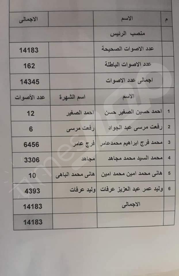 وجاء إجمالي الأصوات في انتخابات سموحة 14183صوتا قاموا بالتصويت لـ6 مرشحين على مقعد الرئيس وهم أحمد الصغير ورفعت مرسى ومحمد فرج عامر ومحمد مجاهد وهانى محمد أمين ووليد عرفات، وإجمالي عدد الأصوات الصحيحة14345، فيما جاء عدد الأصوات الباطلة 162، وإجمالي عدد الأصوات 14345.