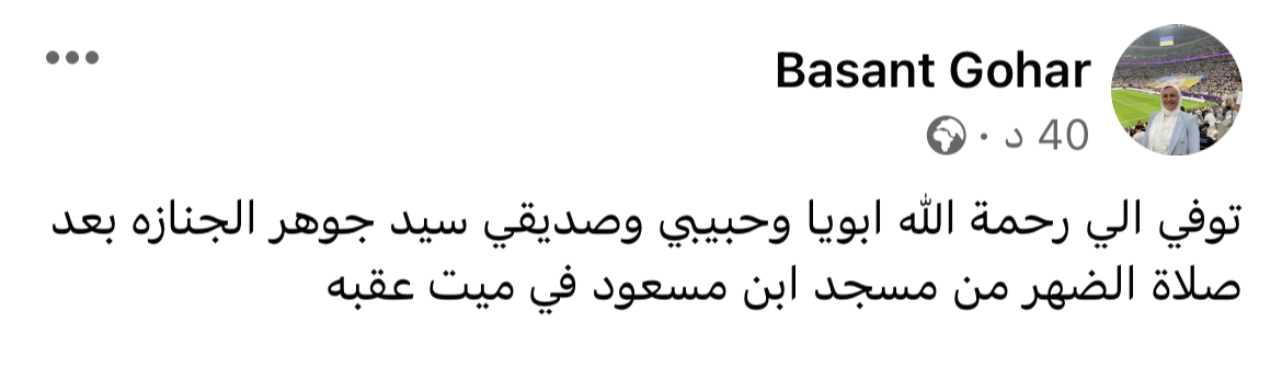 وكتبت بسنت سيد جوهر على صفحتها الشخصية على موقع التواصل الاجتماعى "فيس بوك" قائلة: "توفى إلى رحمة الله ابويا وحبيبي وصديقي سيد جوهر الجنازة بعد صلاة الظهر من مسجد ابن مسعود في ميت عقبه".