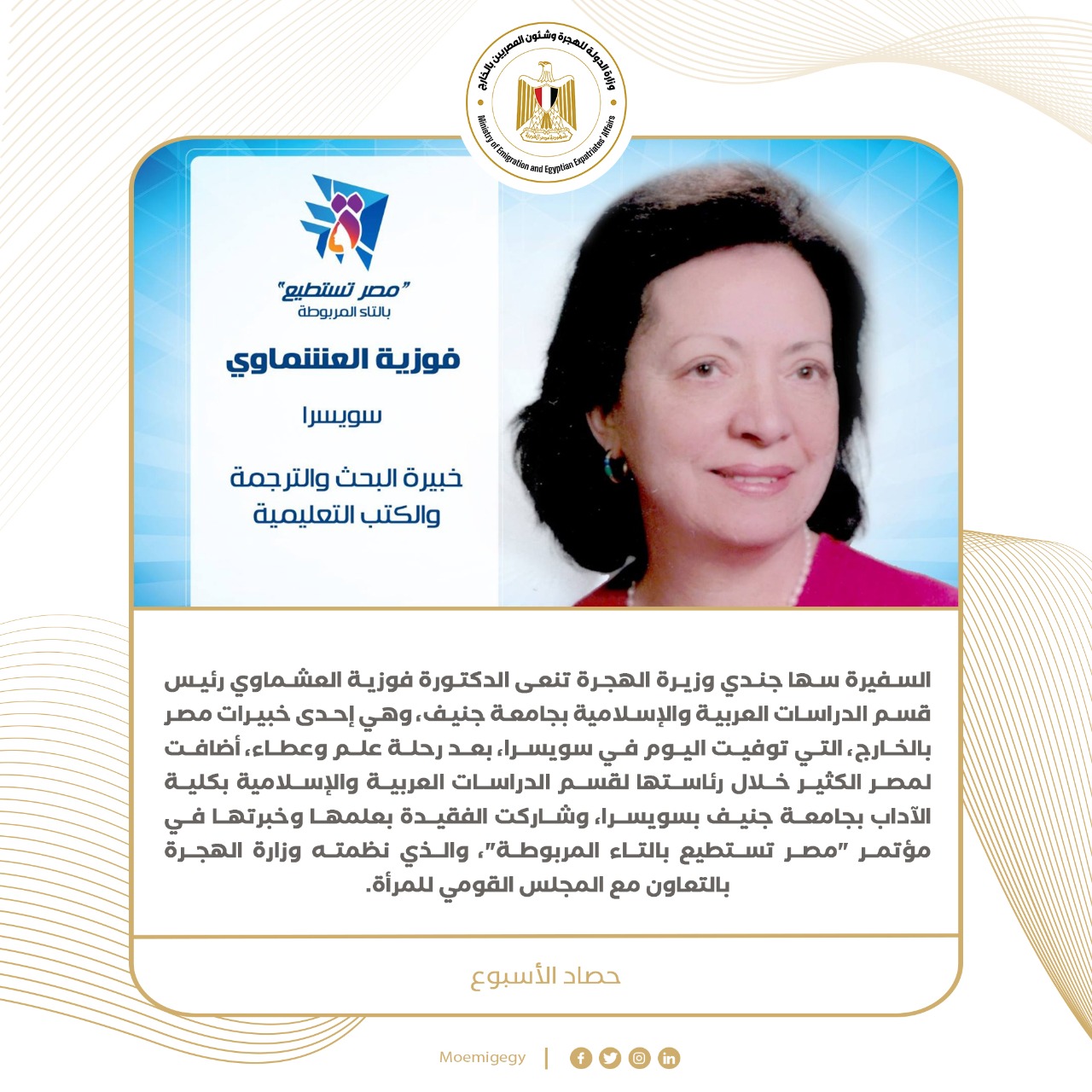 3) السفيرة سها جندي وزيرة الهجرة تنعى الدكتورة فوزية العشماوي رئيس قسم الدراسات العربية والإسلامية بجامعة جنيف، وهي إحدى خبيرات مصر بالخارج، التي توفيت اليوم في سويسرا، بعد رحلة علم وعطاء، أضافت لمصر الكثير خلال رئاستها لقسم الدراسات العربية والإسلامية بكلية الآداب بجامعة جنيف بسويسرا، وشاركت الفقيدة بعلمها وخبرتها في مؤتمر "مصر تستطيع بالتاء المربوطة"، والذي نظمته وزارة الهجرة بالتعاون مع المجلس القومي للمرأة.
