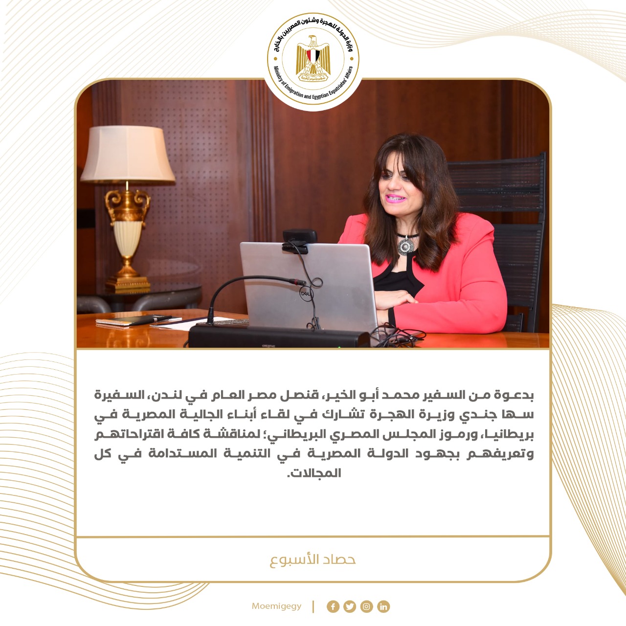 1) بدعوة من السفير محمد أبو الخير، قنصل مصر العام في لندن، السفيرة سها جندي وزيرة الهجرة تشارك في لقاء أبناء الجالية المصرية في بريطانيا، ورموز المجلس المصري البريطاني؛ لمناقشة كافة اقتراحاتهم وتعريفهم بجهود الدولة المصرية في التنمية المستدامة في كل المجالات.