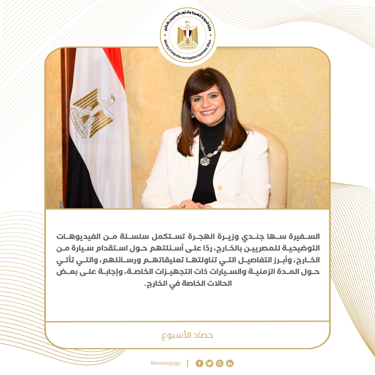 2) السفيرة سها جندي وزيرة الهجرة تستكمل سلسلة من الفيديوهات التوضيحية للمصريين بالخارج، ردًا على أسئلتهم حول استقدام سيارة من الخارج، وأبرز التفاصيل التي تناولتها تعليقاتهم ورسائلهم، والتي تأتي حول المدة الزمنية والسيارات ذات التجهيزات الخاصة، وإجابة على بعض الحالات الخاصة في الخارج.
