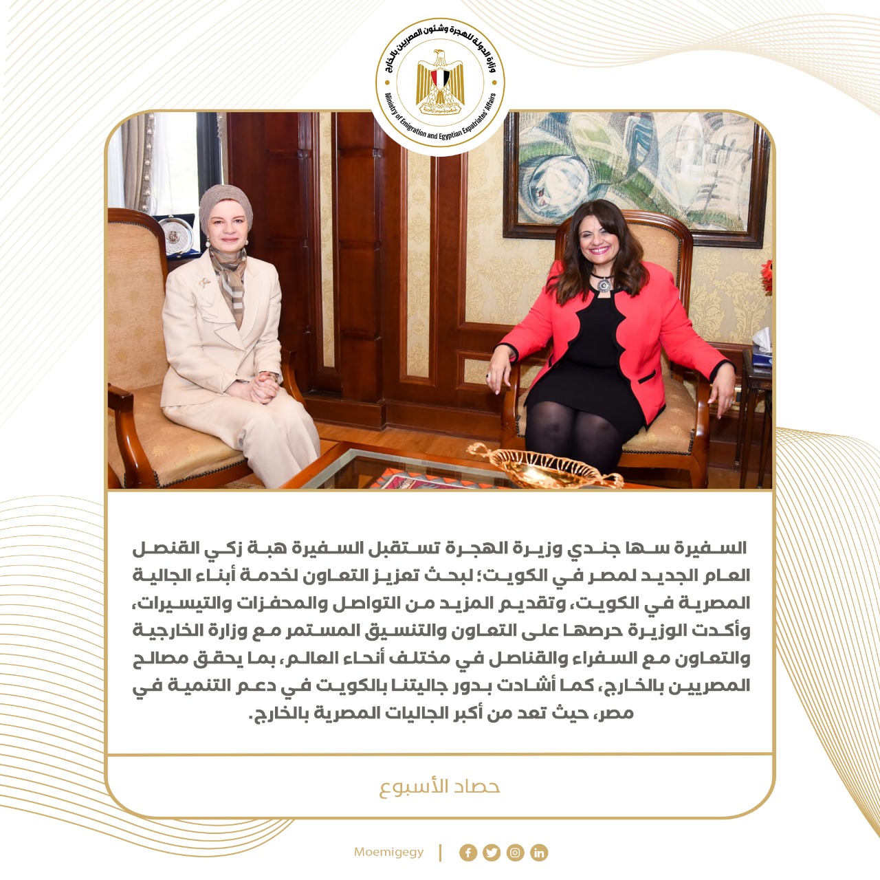 5) السفيرة سها جندي وزيرة الهجرة تستقبل السفيرة هبة زكي القنصل العام الجديد لمصر في الكويت؛ لبحث تعزيز التعاون لخدمة أبناء الجالية المصرية في الكويت، وتقديم المزيد من التواصل والمحفزات والتيسيرات، وأكدت الوزيرة حرصها على التعاون والتنسيق المستمر مع وزارة الخارجية والتعاون مع السفراء والقناصل في مختلف أنحاء العالم، بما يحقق مصالح المصريين بالخارج، كما أشادت بدور جاليتنا بالكويت في دعم التنمية في مصر، حيث تعد من أكبر الجاليات المصرية بالخارج.