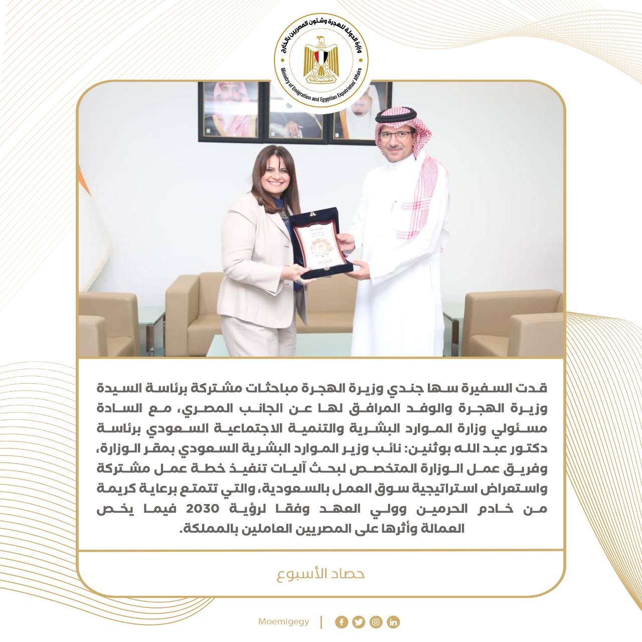 12) عقدت السفيرة سها جندي وزيرة الهجرة مباحثات مشتركة برئاسة السيدة وزيرة الهجرة والوفد المرافق لها عن الجانب المصري، مع السادة مسئولي وزارة الموارد البشرية والتنمية الاجتماعية السعودي برئاسة دكتور عبد الله بوثنين: نائب وزير الموارد البشرية السعودي بمقر الوزارة، وفريق عمل الوزارة المتخصص لبحث آليات تنفيذ خطة عمل مشتركة واستعراض استراتيجية سوق العمل بالسعودية، والتي تتمتع برعاية كريمة من خادم الحرمين وولي العهد وفقا لرؤية 2030 فيما يخص العمالة وأثرها على المصريين العاملين بالمملكة.