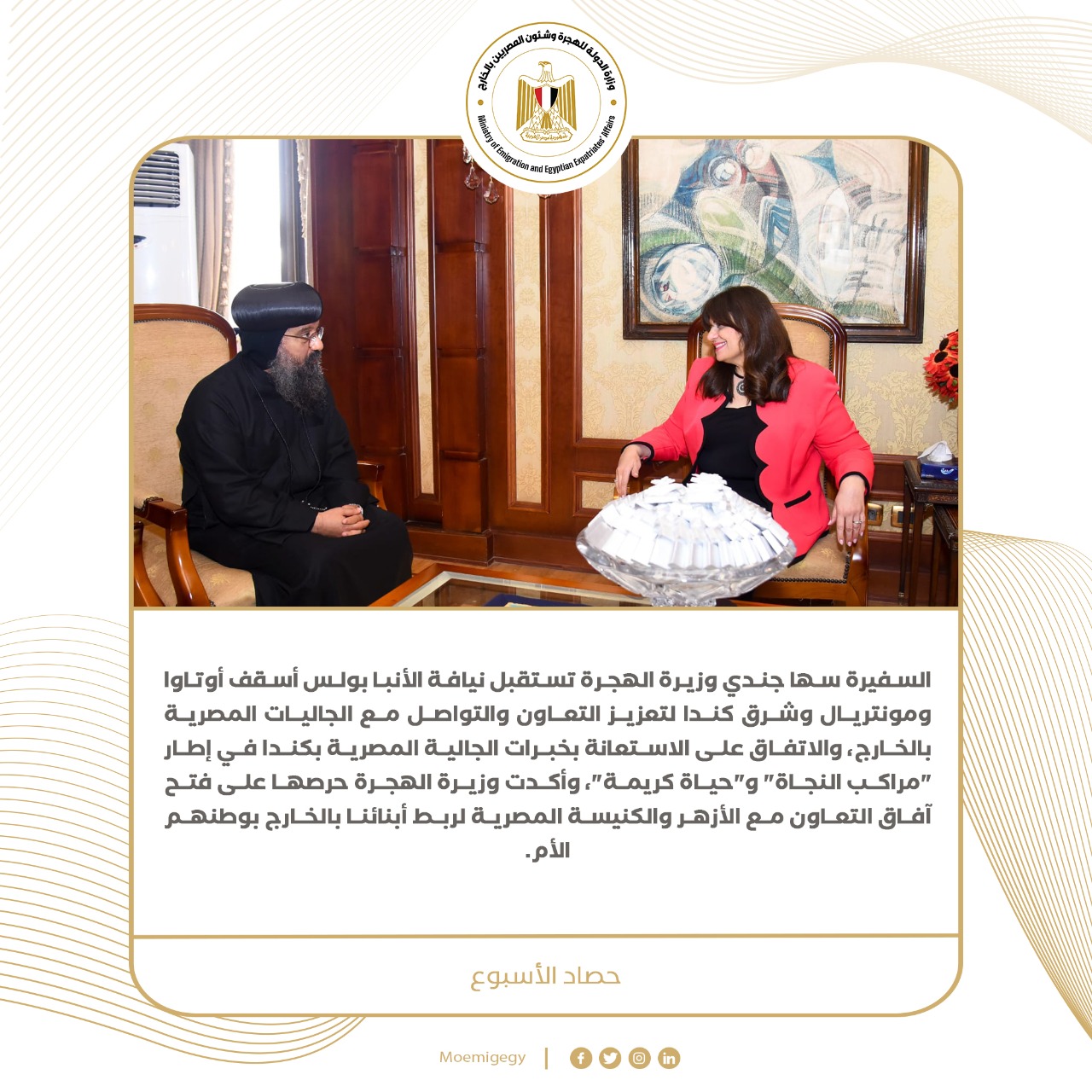 4) السفيرة سها جندي وزيرة الهجرة تستقبل نيافة الأنبا بولس أسقف أوتاوا ومونتريال وشرق كندا لتعزيز التعاون والتواصل مع الجاليات المصرية بالخارج، والاتفاق على الاستعانة بخبرات الجالية المصرية بكندا في إطار "مراكب النجاة" و"حياة كريمة"، وأكدت وزيرة الهجرة حرصها على فتح آفاق التعاون مع الأزهر والكنيسة المصرية لربط أبنائنا بالخارج بوطنهم الأم.