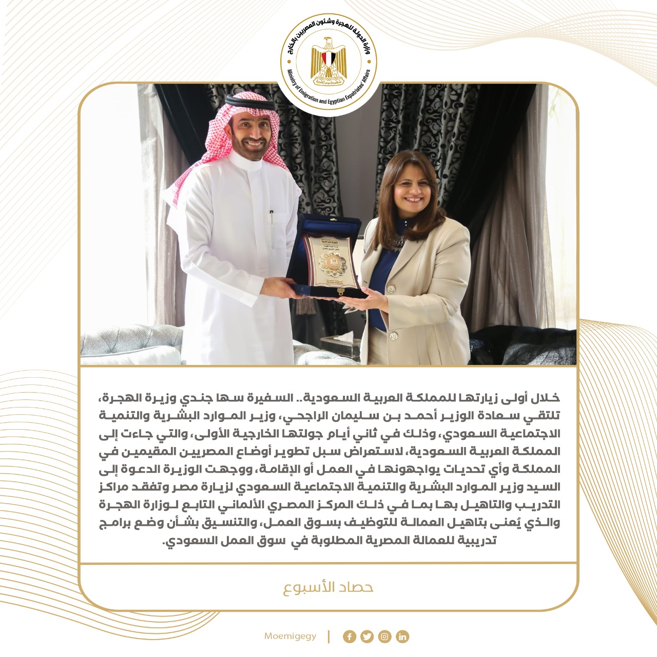 11) خلال أول فعالياتها بالمملكة العربية السعودية.. السفيرة سها جندي وزيرة الهجرة، سعادة الوزير أحمد بن سليمان الراجحي، وزير الموارد البشرية والتنمية الاجتماعية السعودي، وذلك في ثاني أيام جولتها الخارجية الأولى، والتي جاءت إلى المملكة العربية السعودية، لاستعراض سبل تطوير أوضاع المصريين المقيمين في المملكة وأي تحديات يواجهونها في العمل أو الإقامة، ووجهت الوزيرة الدعوة إلى السيد وزير الموارد البشرية والتنمية الاجتماعية السعودي لزيارة مصر وتفقد مراكز التدريب والتاهيل بها بما في ذلك المركز المصري الألماني التابع لوزارة الهجرة والذي يُعنى بتاهيل العمالة للتوظيف بسوق العمل، والتنسيق بشأن وضع برامج تدريبية للعمالة المصرية المطلوبة في سوق العمل السعودي.
