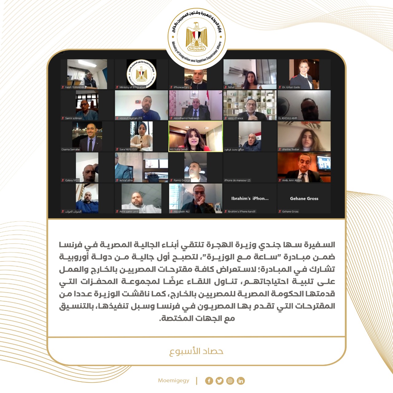 6) السفيرة سها جندي وزيرة الهجرة تلتقي أبناء الجالية المصرية في فرنسا ضمن مبادرة "ساعة مع الوزيرة"، لتصبح أول جالية من دولة أوروبية تشارك في المبادرة؛ لاستعراض كافة مقترحات المصريين بالخارج والعمل على تلبية احتياجاتهم، تناول اللقاء عرضًا لمجموعة المحفزات التي قدمتها الحكومة المصرية للمصريين بالخارج، كما ناقشت الوزيرة عددا من المقترحات التي تقدم بها المصريون في فرنسا وسبل تنفيذها، بالتنسيق مع الجهات المختصة.