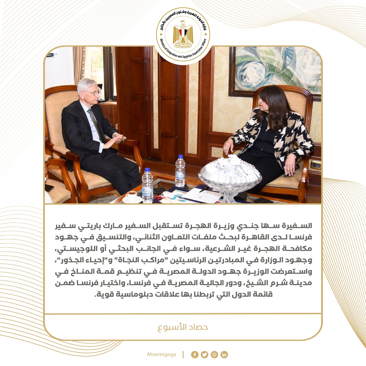 8) السفيرة سها جندي وزيرة الهجرة تستقبل السفير مارك باريتي سفير فرنسا لدى القاهرة لبحث ملفات التعاون الثنائي، والتنسيق في جهود مكافحة الهجرة غير الشرعية، سواء في الجانب البحثي أو اللوجيستي، وجهود الوزارة في المبادرتين الرئاسيتين "مراكب النجاة" و"إحياء الجذور"، واستعرضت الوزيرة جهود الدولة المصرية في تنظيم قمة المناخ في مدينة شرم الشيخ، ودور الجالية المصرية في فرنسا، واختيار فرنسا ضمن قائمة الدول التي تربطنا بها علاقات دبلوماسية قوية.