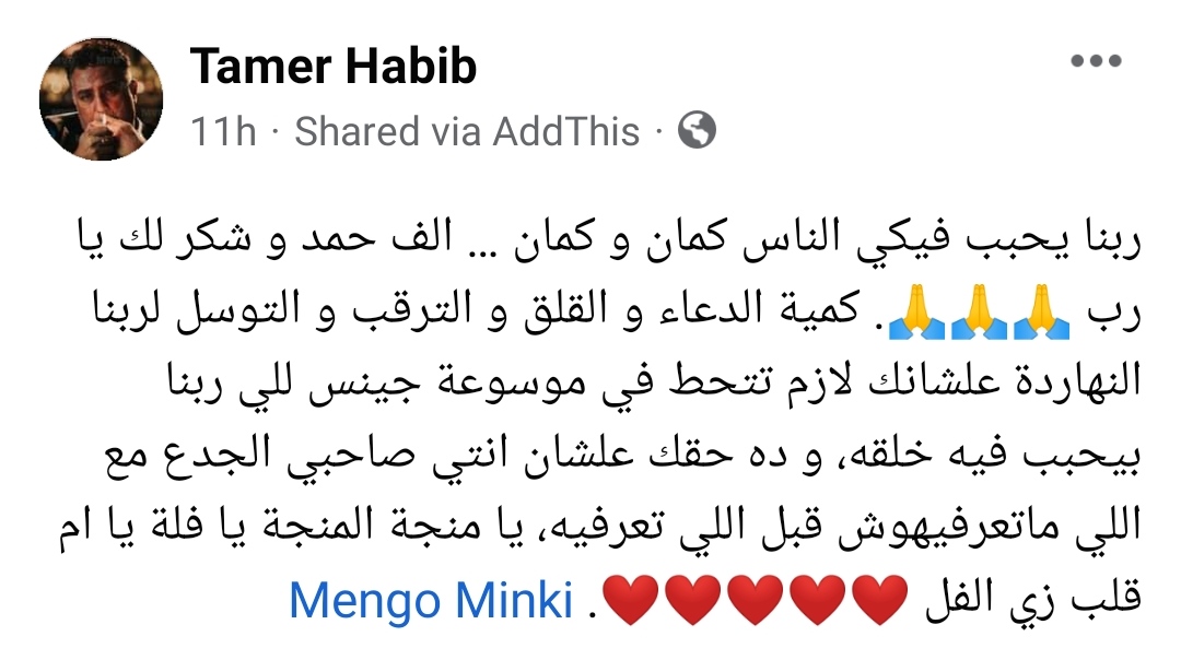 نشر تامر حبيب عبر صفحته على موقع تبادل الصور والفيديوهات “إنستجرام” قائلا:” ربنا يحبب فيكي الناس كمان و كمان ألف حمد و شكر لك يا رب كمية الدعاء و القلق و الترقب و التوسل لربنا النهاردة علشانك لازم تتحط في موسوعة جينس".