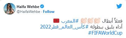 وكتبت هيفاء وهبي في تغريدة عبر حسابها على موقع التواصل الاجتماعي تويتر: "فعلاً أبطال المغرب أداء يليق ببطولة كأس العالم قطر 2022".